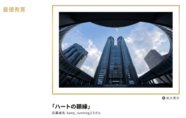 広角レンズの特性を活かしたシンメトリーなハート形の構図が大胆で印象に残ります。都庁ビルが上空にどこまでも伸びていくような迫力も感じますね。ブルーの色調によりスッキリとクールにまとまっています。
